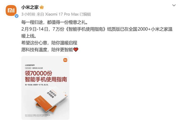 按照 小米之家 账号引见,从今天起到2月14日,会正在全国2000+小米之店免费派发7万份《智妙手机利用指南》,同时上线了电子版,便利大师下载。2025年全国手机销量虽然同比下降了2。4%,但销量仍然高达3。07亿台,大约每四人中就有一人正在2025年换了新手机,可见手机正在国内普及率之高。可是对于接管新事物比力慢的白叟来说,若何用好智妙手机一曲是问题。